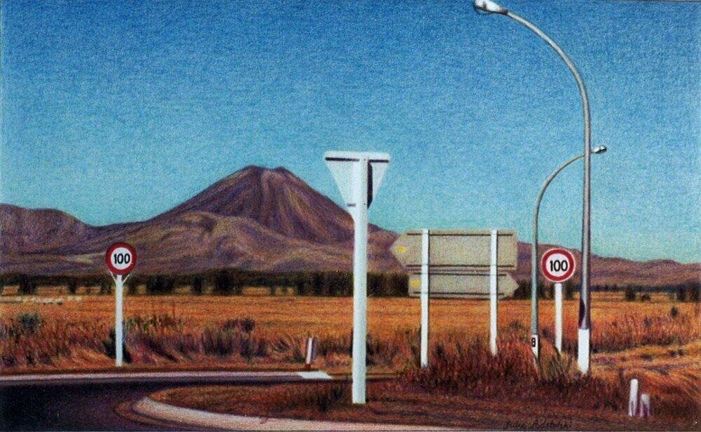 Two "100" speed limit signs among other man-made posts with the volcano, Mt Ngauruhoe, behind. Year 2003. sold