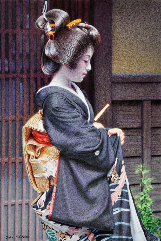 Katsutomo adopts a thoughtful pose on the day of her erikae - (the day she becomes a geiko). Drawn in 2015. sold