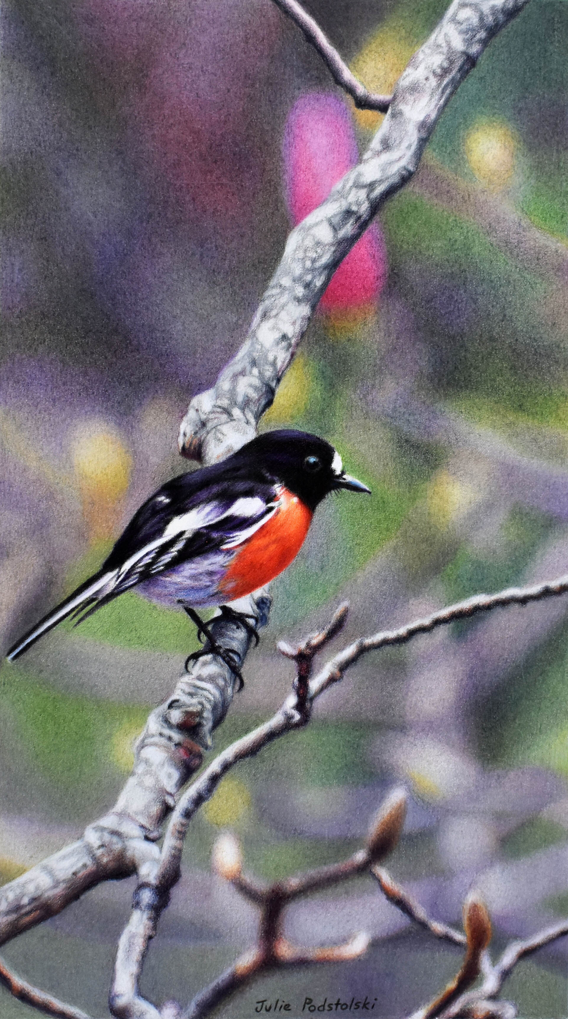 A male scarlet robin stands on a branch of a budding magnolia tree, looking as glowing and radiant as a tiny Japanese lantern. Araluen, Perth hills. Drawn in January 2025.