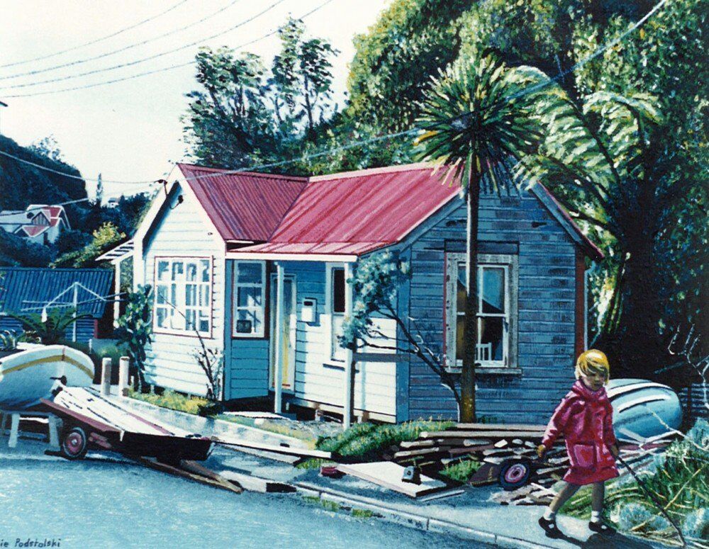 Alicia in Holloway Road, Aro Valley, Wellington. (This painting was destroyed in our 1992 house fire.) year 1992.