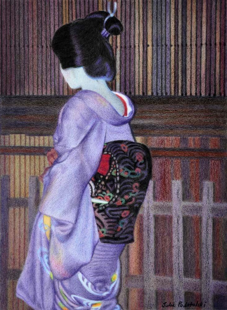 A geiko in a violet kimono elegantly floats past on her way to an ochaya (tea-house). year 2015. sold