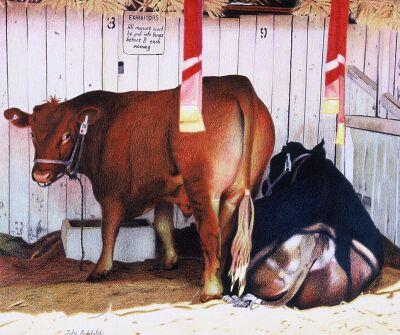 Cattle with red ribbons at Perth Royal Show. 2002 Rockingham Regional Art Award - Best Painting of a Rural Nature. year 2001. Sold.