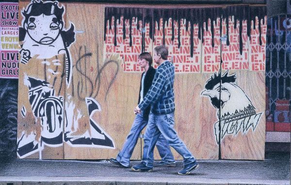Guys walking past hoardings in Kings Cross. Year 2004. sold