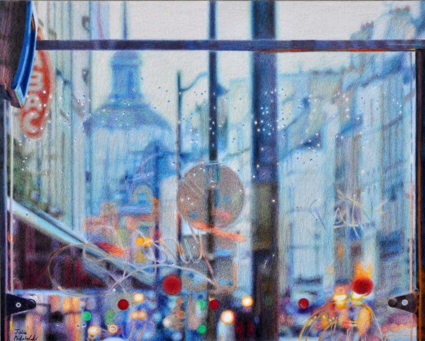 coloured pencil drawing. Looking through two plate glass windows of the bus stop to abstracted rue Saint Antoine beyond. Year 2011. sold