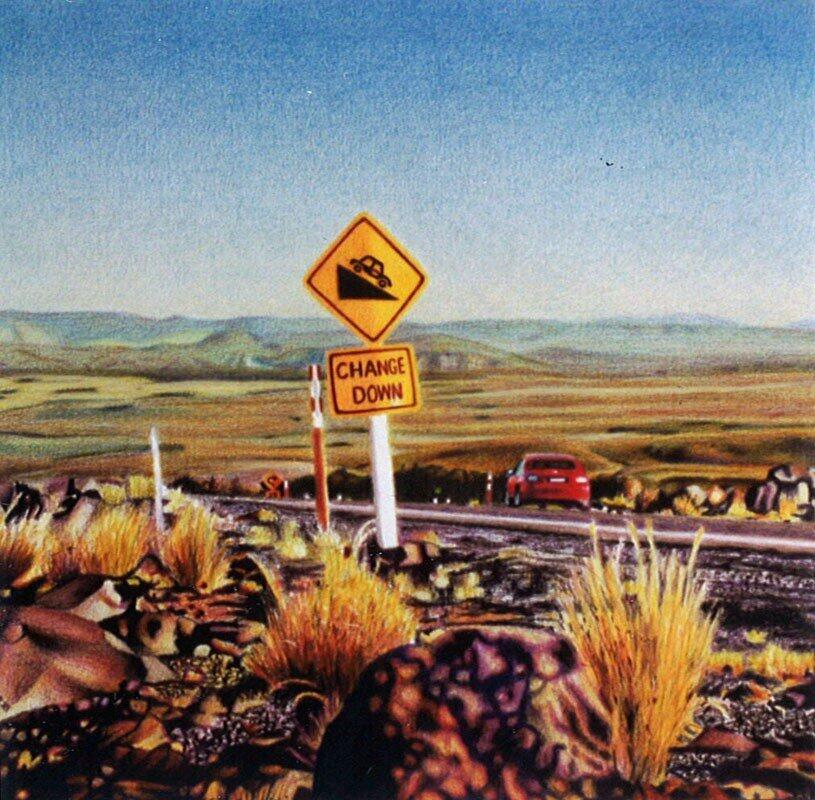 Street sign and car on the road coming down from Mount Ruapehu, New Zealand. (Actully it is my hire car parked on the side of the road while I get out to take photos.) Year 2003. sold