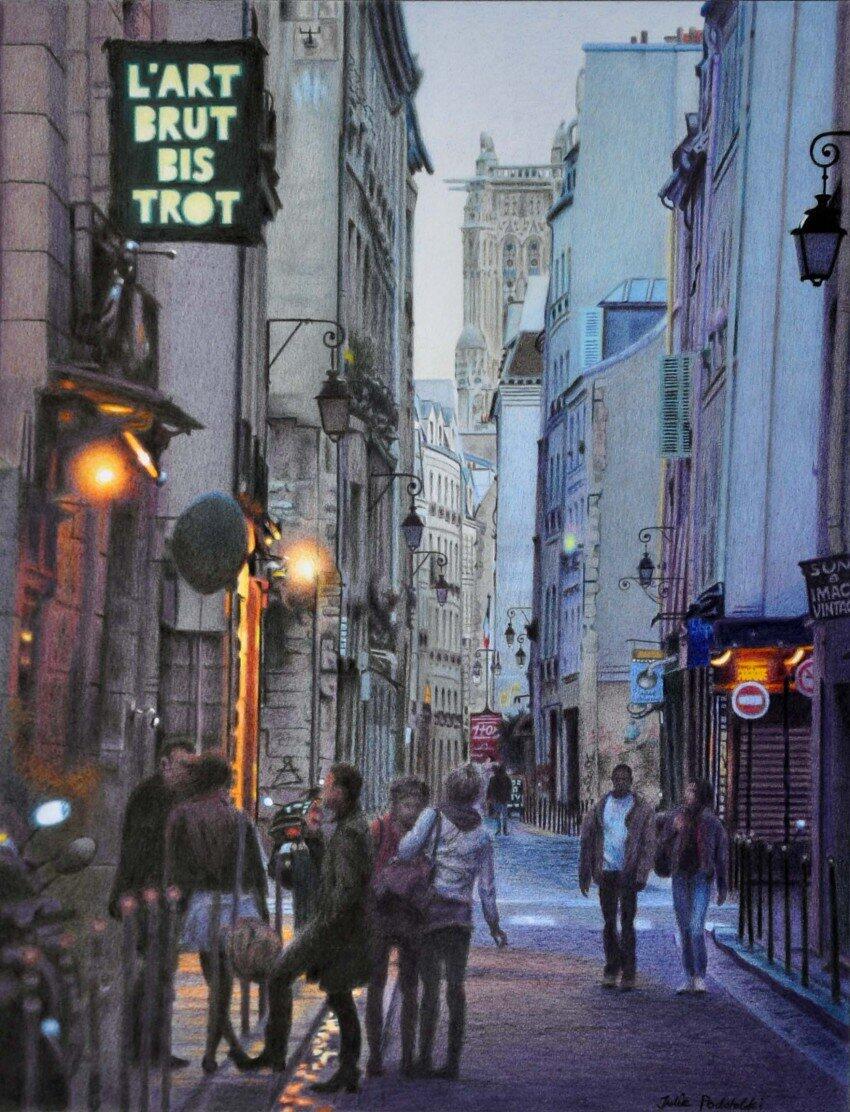 Coloured pencil drawing. People meet on rue Quincampoix, the Marais, on a spring evening. Year 2012. sold