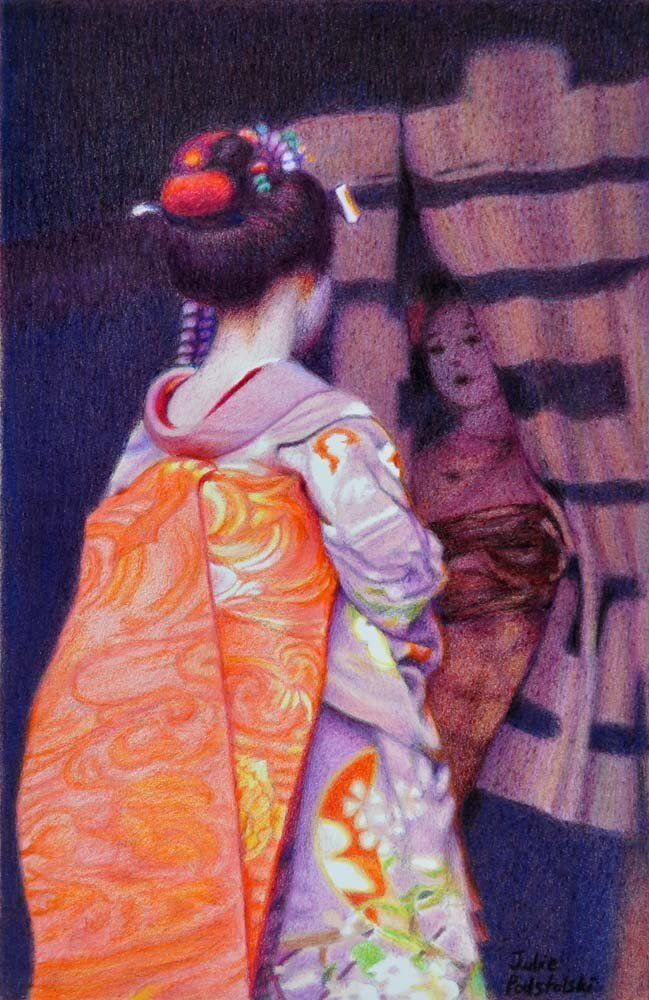 "Ephemera" (plural) - short lived - referring to the state of being maiko in particular and to youth and beauty in general. Both maiko in this drawing; Mameyuri and Katsuyuki, have retired from being geiko. Both now lead modern lives. Year 2016. sold