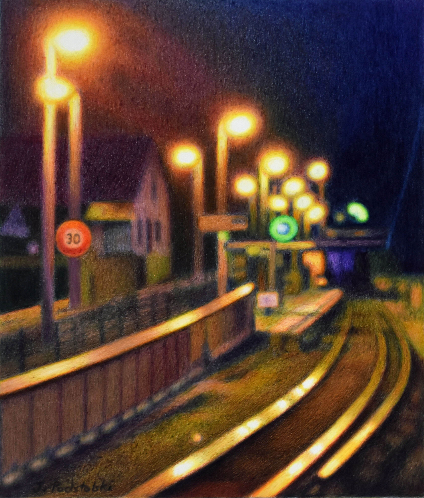 A small station somewhere in Europe (Chamonix) invites the question, "Where next?" Drawn in 2021. AUD $1200.