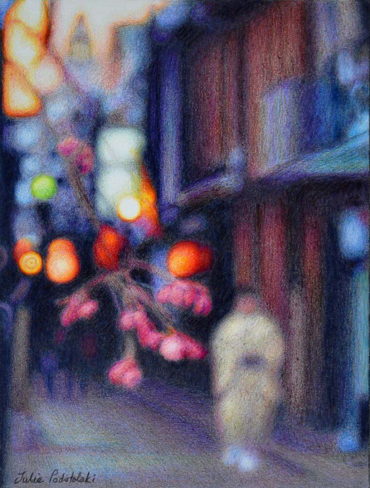Pontocho at dusk with sakura (cherry blossom) in the foreground. Sakura, geisha, the lights, Kyoto and Japan; this is my fascination. Year 2016. sold