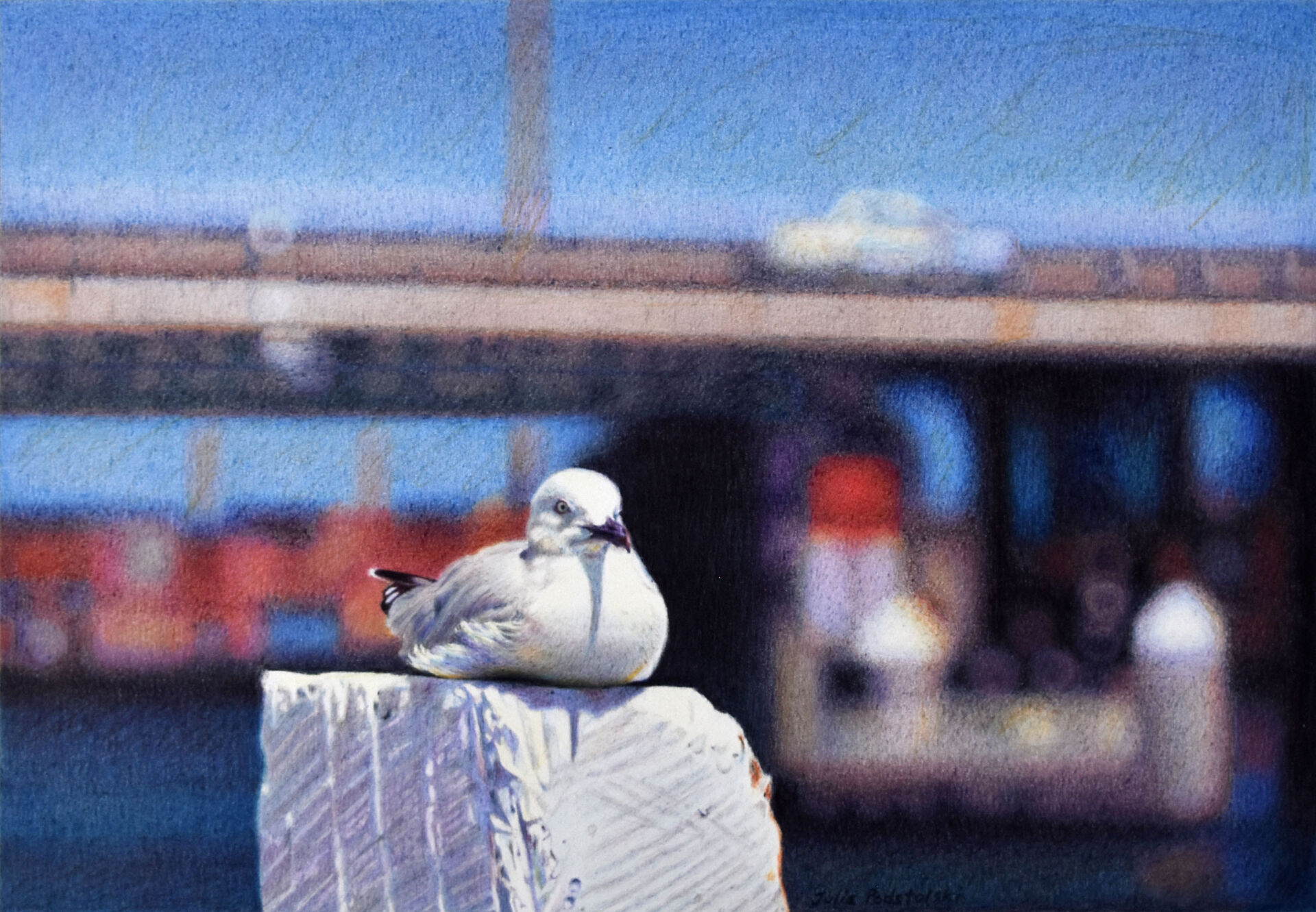 While resting in the morning sun a silver gull observes life from his platform at East Fremantle jetty. 2022 Sold