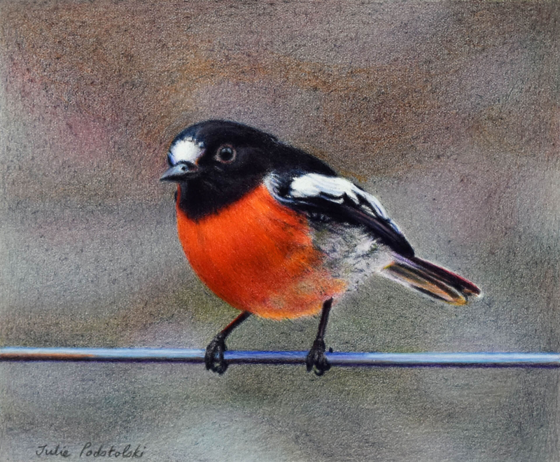 Black, white and spectacularly red, the Scarlet Robin reminds me of a Japanese lantern. 2022. SOLD