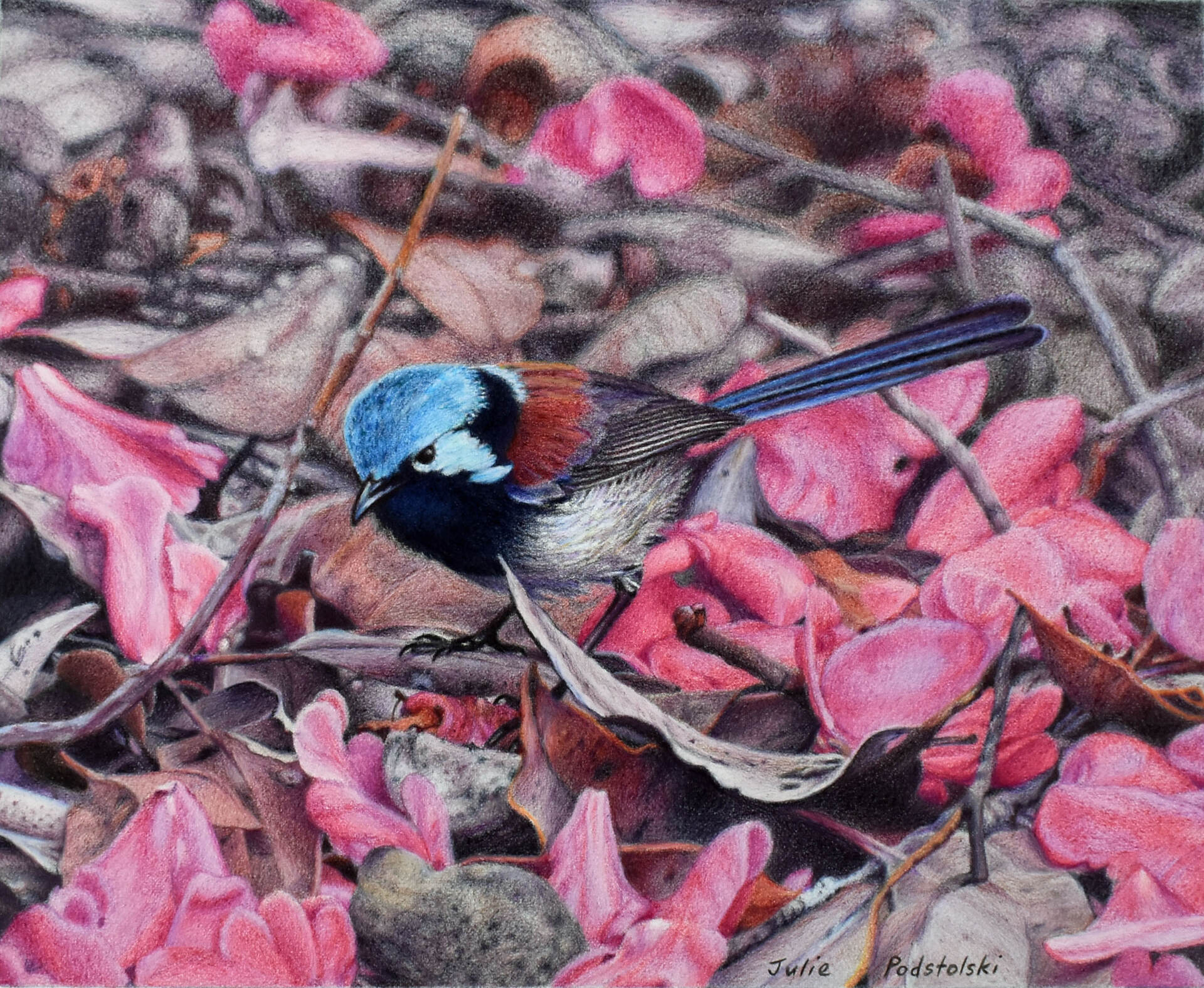 A red winged fairy wren fossicks amid leaf litter which includes dropped camellia petals. Araluen, Perth hills. Drawn October 2024.