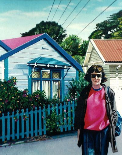 My sister, Jeannie Beauchamp, outside a Thorndon house. Painting destroyed in our 1992 house fire. Year painted 1992.