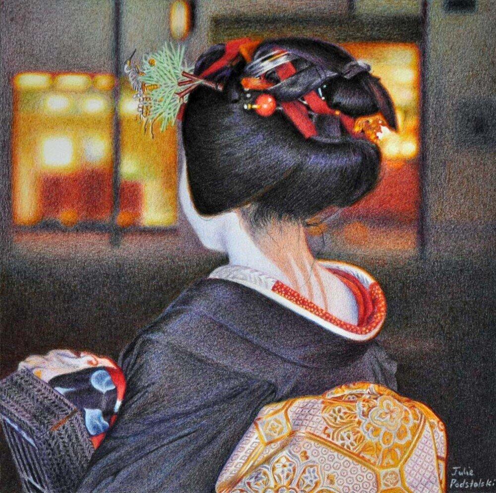 Satsuki waits to cross Shijo-dori at night. Her hair is dressed in the fabulous sakkou style. This style is worn for just two weeks before her erikae. year 2015. sold