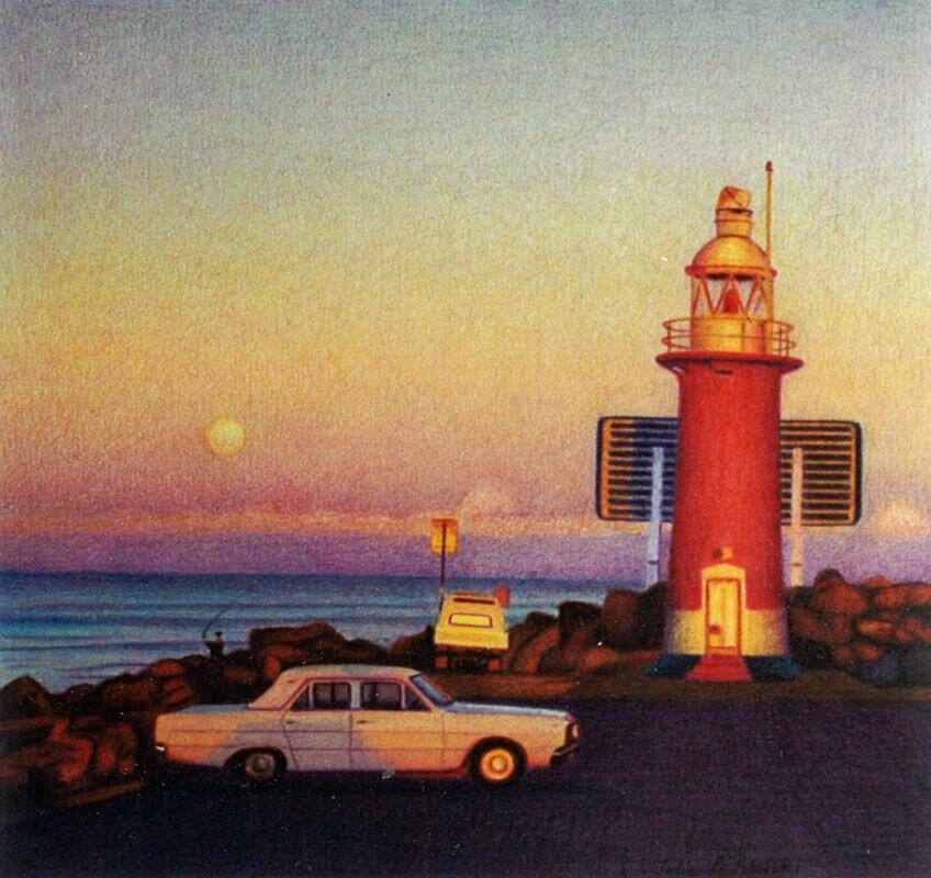 As the rising sun illuminates the red lighthouse at North Mole (Western Australia), the moon descends in the west. Year 2003. sold