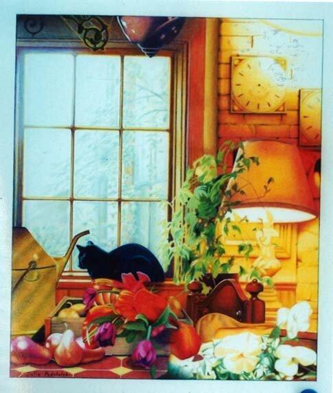 A still life with cat in coloured pencils composed from a collage. year 1997. sold