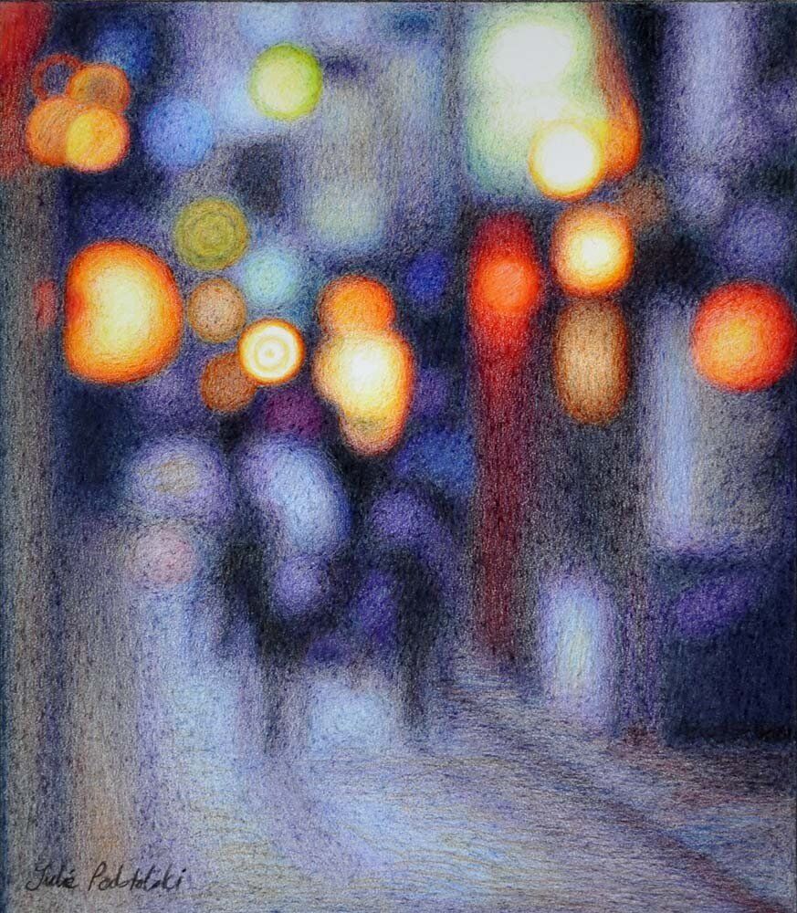 Couples stroll together in Pontocho on a spring evening when lights and lanterns are popping on. Year 2015. sold