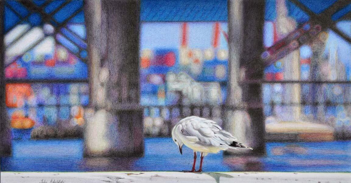 Portrait of a seagull with an urban-scape of Fremantle port behind. Year 2013. sold