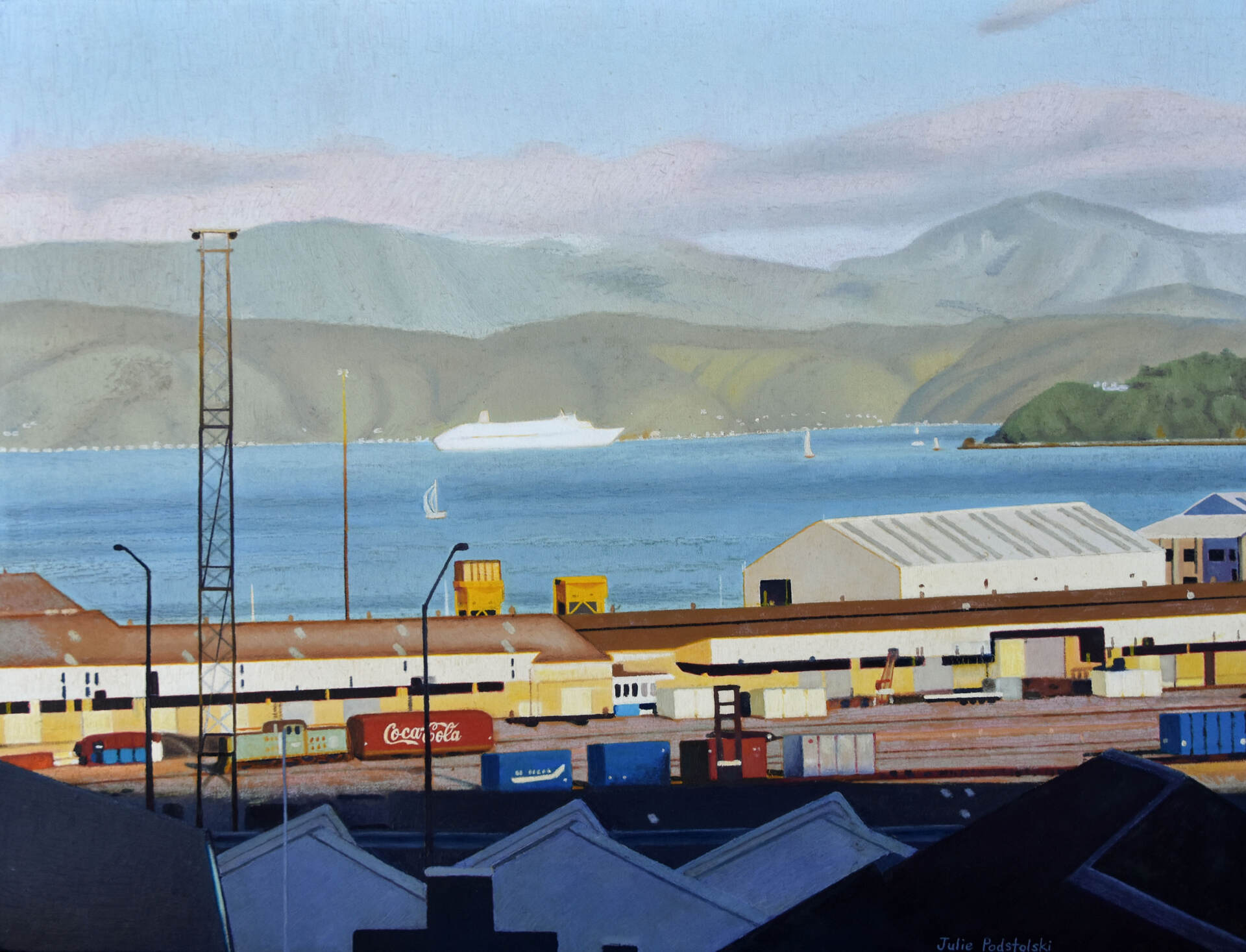 An oil painting of Wellington harbour.