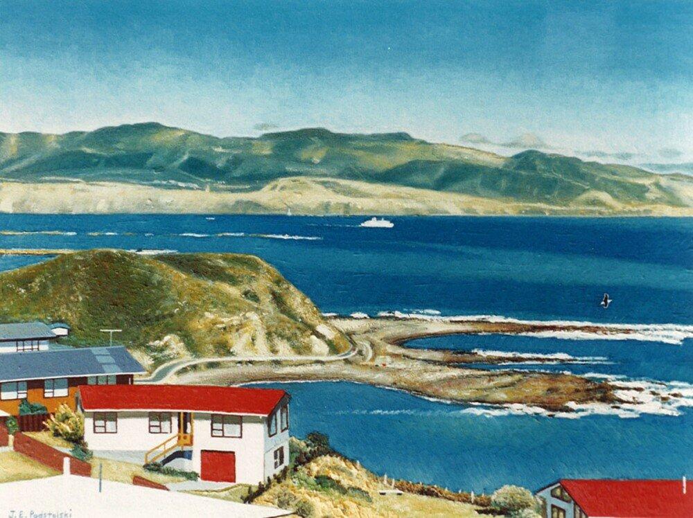 From some high point on Wellington's hills, looking down over Island Bay and across the water to the eastern hills. Year 1991. sold