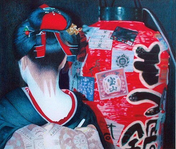 A maiko in Pontocho passes a lantern. sold: In the collection of the City of Belmont, Western Australia. Year 2006.