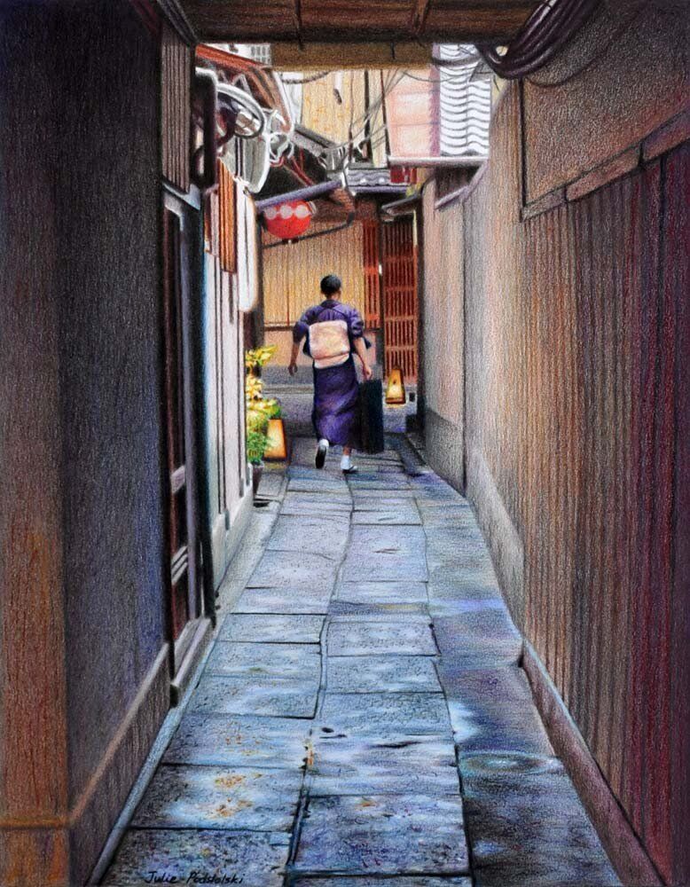 At the far end of this dark passage is a fine restaurant. A waitress, dressed traditionally, rushes out of a door and around the corner. From where I stand, the scene is other-worldly. Year 2015. sold