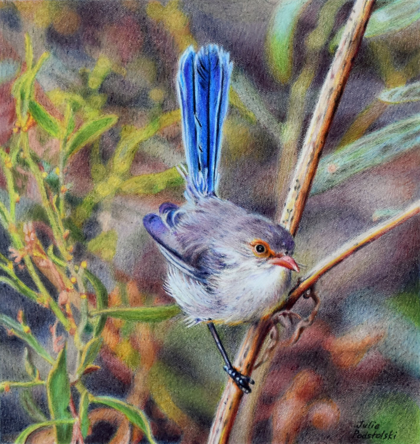 A female Splendid Fairy Wren plays hide-and-seek with me at Booyeembara Park, Fremantle. 2022. SOLD