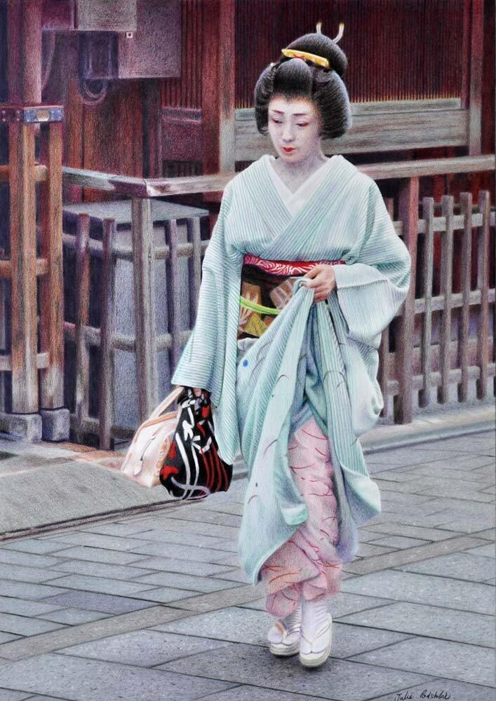 As each maiko and geiko walks in public, she is scrutinized by passers-by. At least her thoughts are hers alone. This geiko is Mikako. Year 2014. sold
