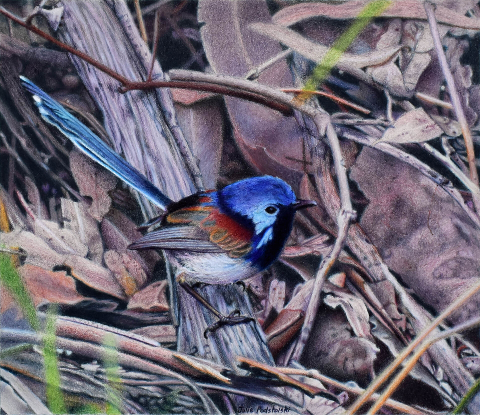 A community of purple-backed fairy wrens call Matilda Bay Reserve home. This individual is a male in breeding plumage. Drawn in December 2024.