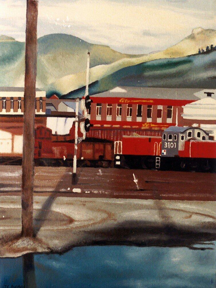 The old railway station area of Christchurch at Addington with Port Hills in the distance. This is an historic piece since the railway station is long gone. Year 1983. sold