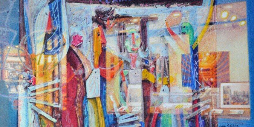 Art and reflections in a window of Galerie L. de Puybaudet, rue de Seine, Saint Germain des Prés. Permission was given by M. Laurent de Puybaudet for me to draw the gallery window. The art is by Armand Avril. Year 2011. sold