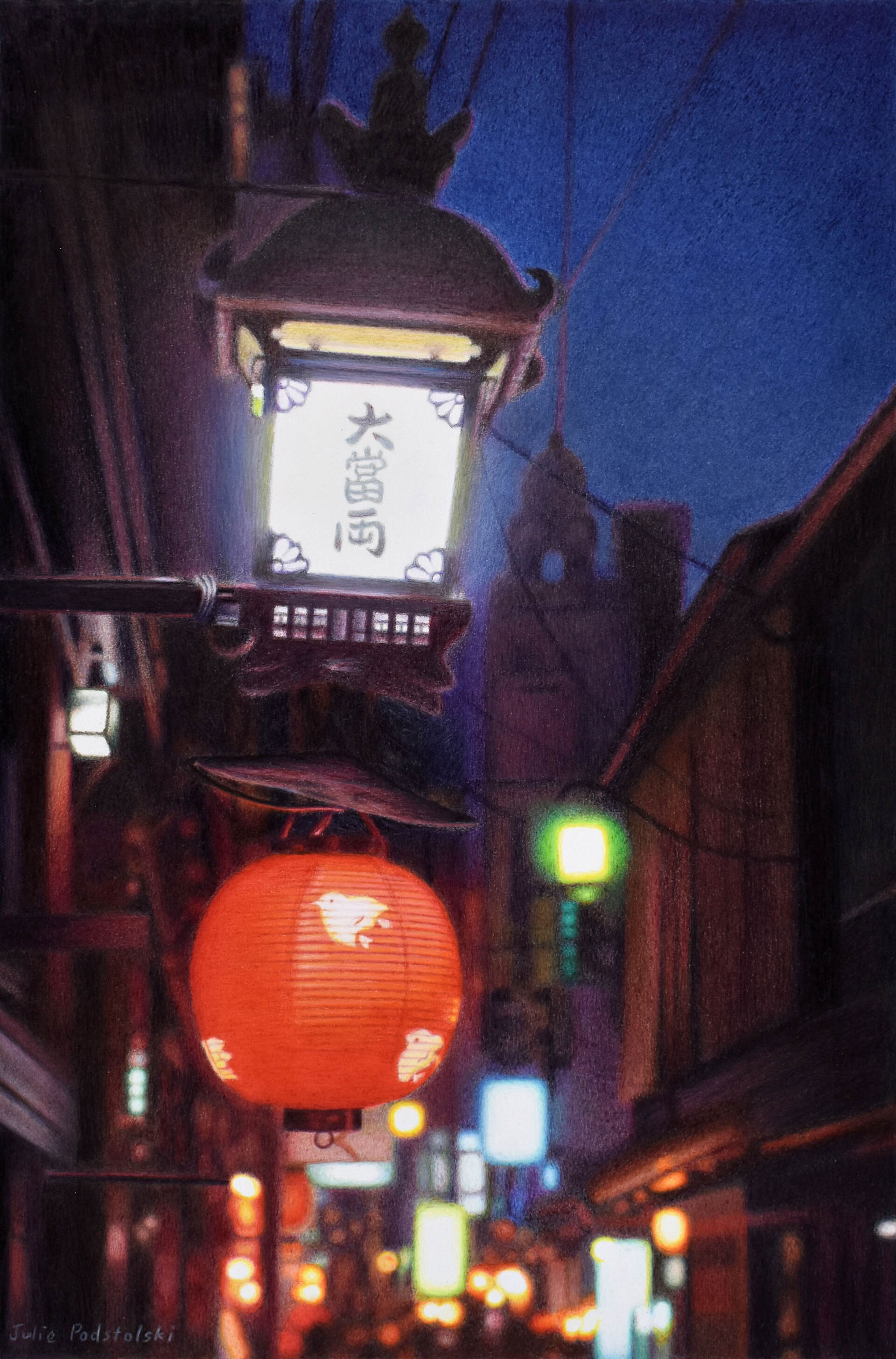 Glowing colours from lanterns and lamps intensify in contrast with the deepening darkness. Pontocho. Drawn in February 2025.