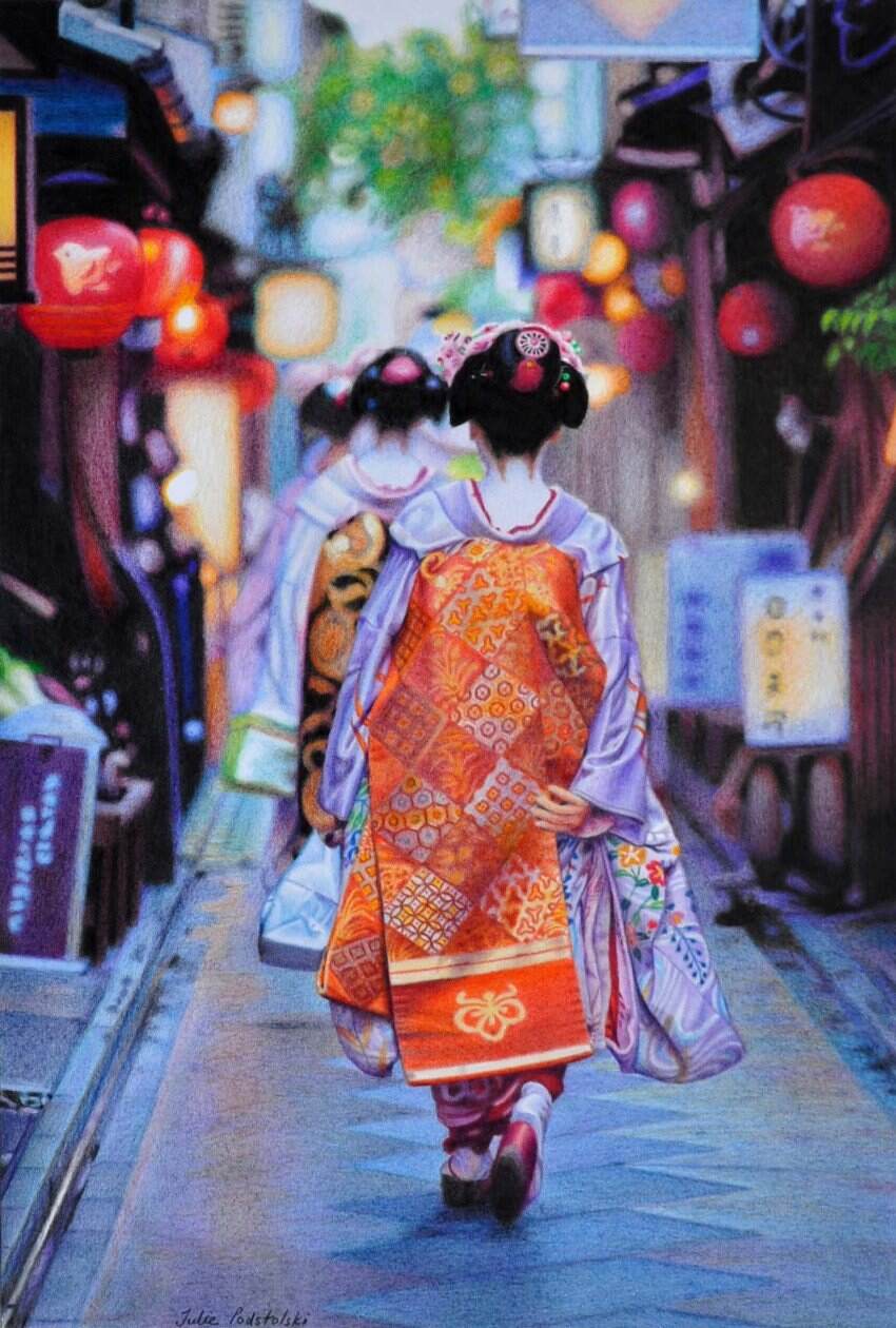 This drawing is from a photo taken by Onihide, now deceased. He gave me permission to draw from his photograph. Maiko in Pontocho leave the theatre after performing their spring dances. Private collection, New York. Year 2011.