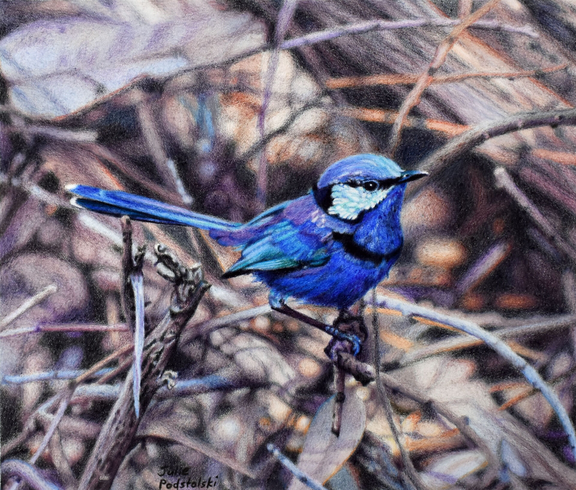 A male splendid fairy wren pops up from the undergrowth to pose for this drawing. Bibra Lake. Drawn in 2024.