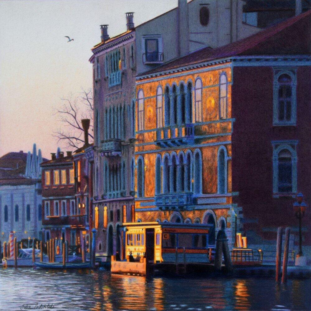 The sun is rising on the Grand Canal in Venice. Reflecting its intense directional light are the palazzos and the Accademia vaporetto stop. The palazzo directly behind the vaporetto stop is Palazzo Barbarigo and the building on the far left is the home of the Peggy Gugenheim collection. Year 2019. Sold.