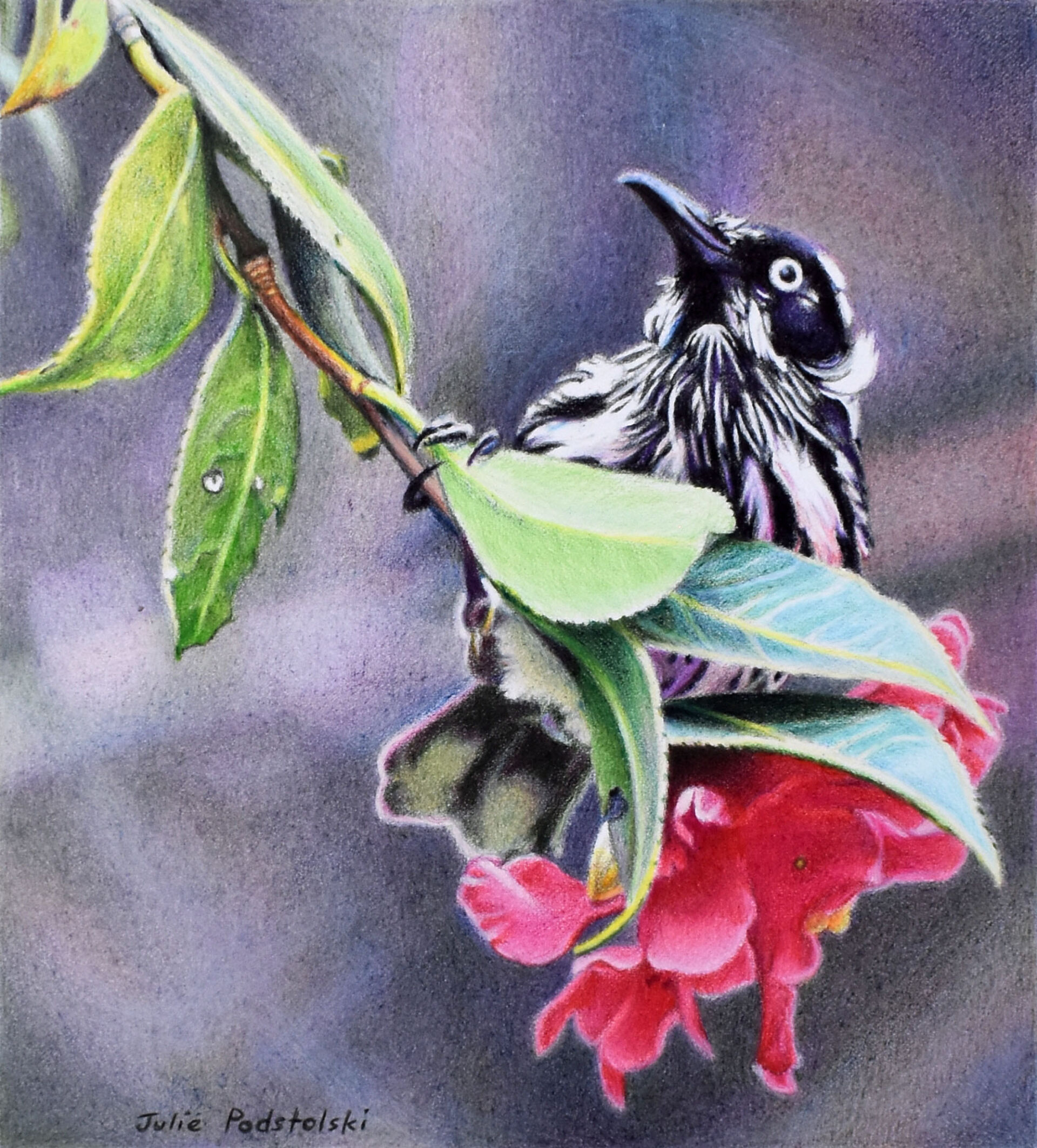 A new holland honeyeater enjoys a ride on a camellia branch as it swings in the winter breeze.