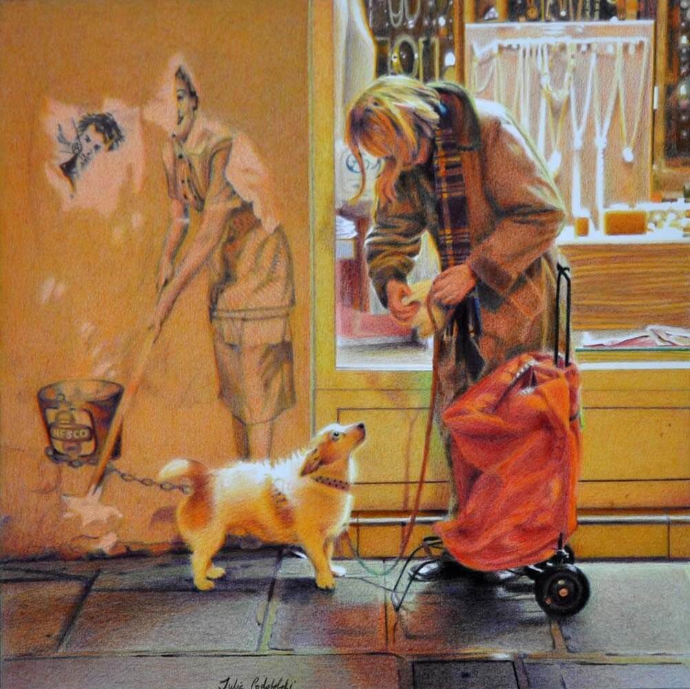 Coloured pencil drawing. Tableau: a group of models or motionless figures representing a scene. A moment caught in Saint Germain des Près one evening; art meets life! Year 2014. sold