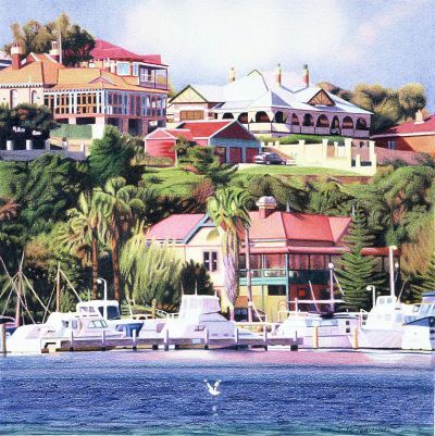 Swan River with its boats and the houses of Bolton and Angwin Streets, East Fremantle. Year 2002. sold
