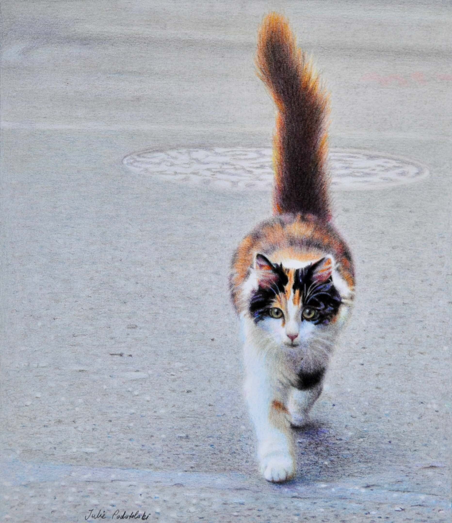 Coloured pencil drawing by Julie Podstolski. This little cat trotted up to see me when I was photographing outside Monet's garden. She is also the subject of "Interlude". Year 2013. sold