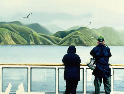 Tourists watching birds on the inter-island ferry between Wellington and Picton. Artist's own collection. Year 2000.