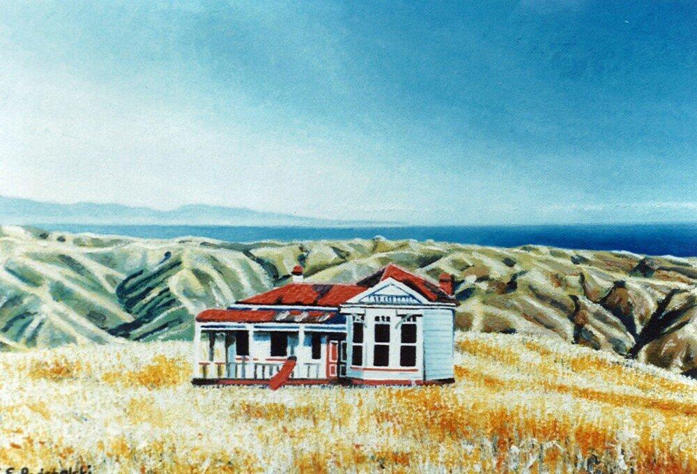 An old villa which I transplanted onto the top of the Karori hills; in other words a dream landscape. Year 1991. sold