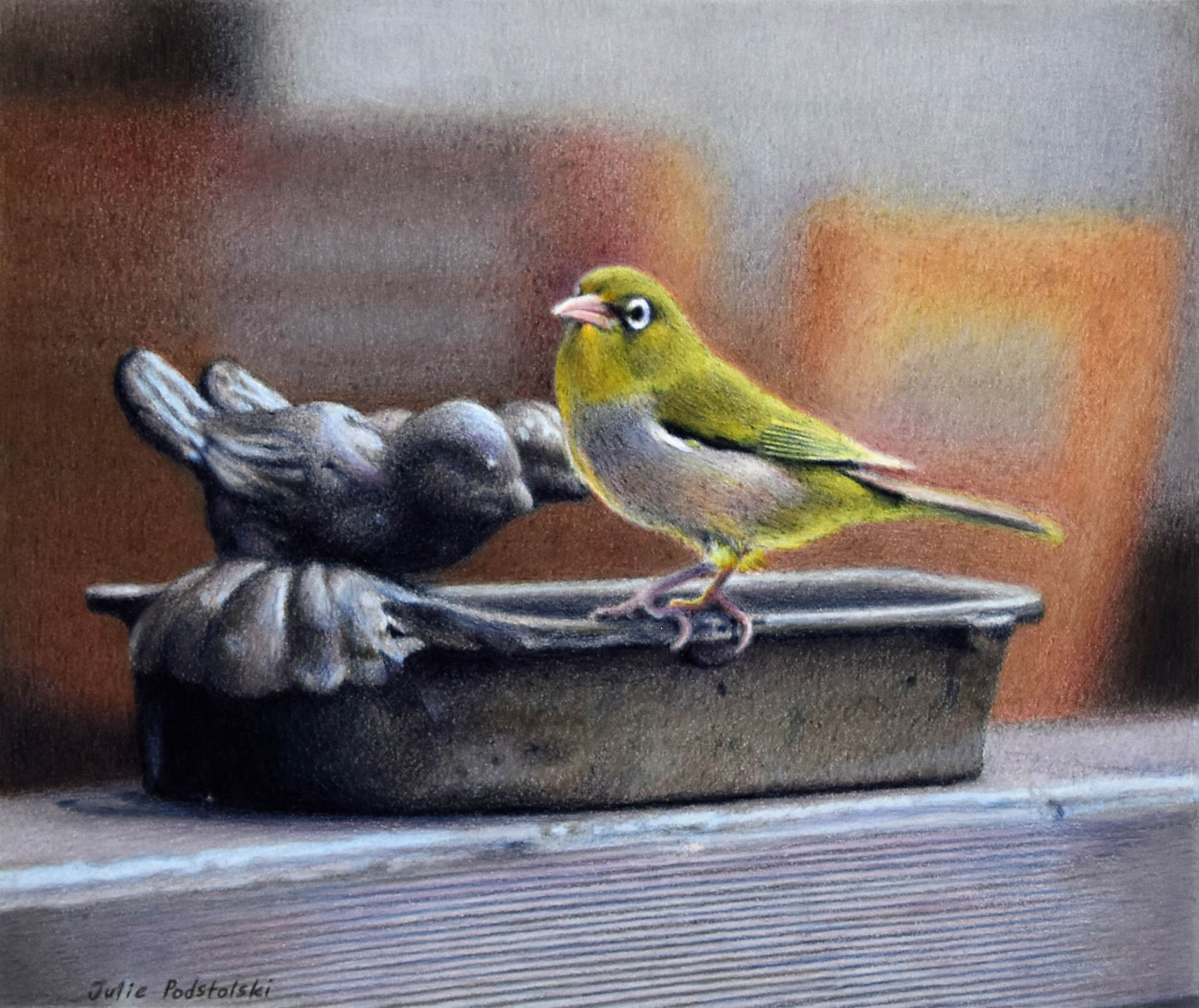 A Silvereye drops in for a drink at an elegant water dish. 2021 SOLD