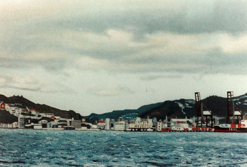 Looking across the harbour back at Wellington, New Zealand, on a windy winter's day. Artist's own collection. Year 1990.