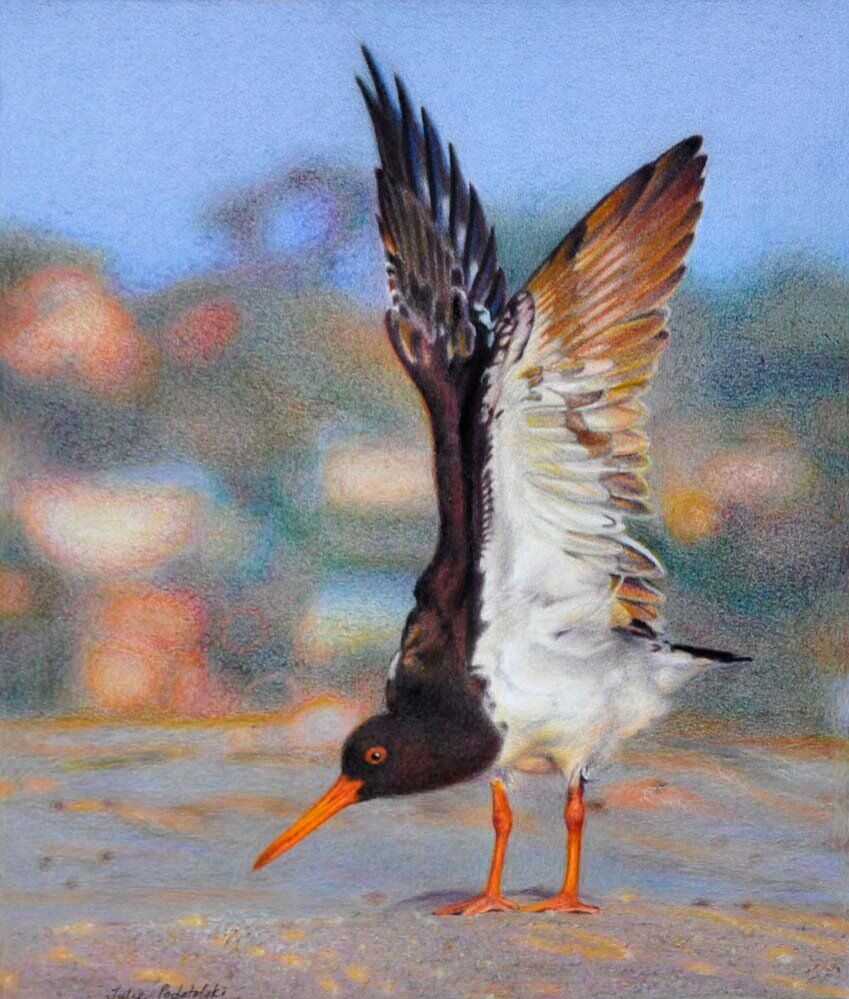 A pied oystercatcher stretching on the sand-bar at Point Walter in Perth, Western Australia. sold