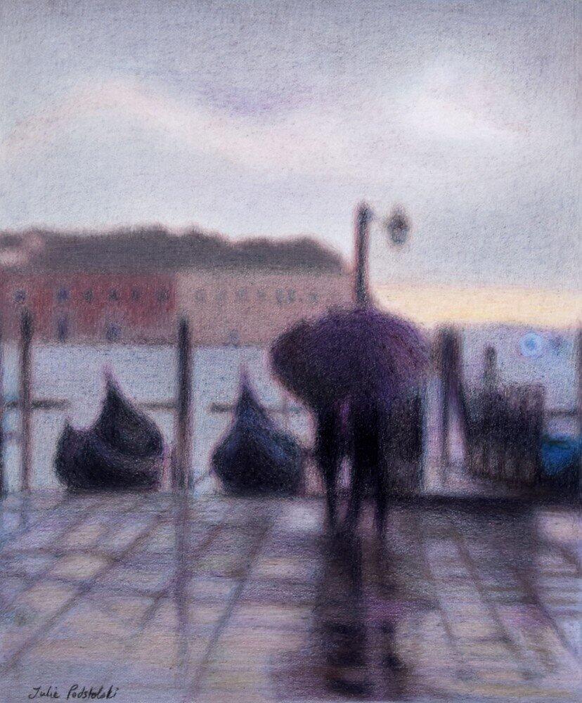 Unrelenting winter rain falls over Venice as the tide stealthily rises. Drawn in 2019. AUD $1200